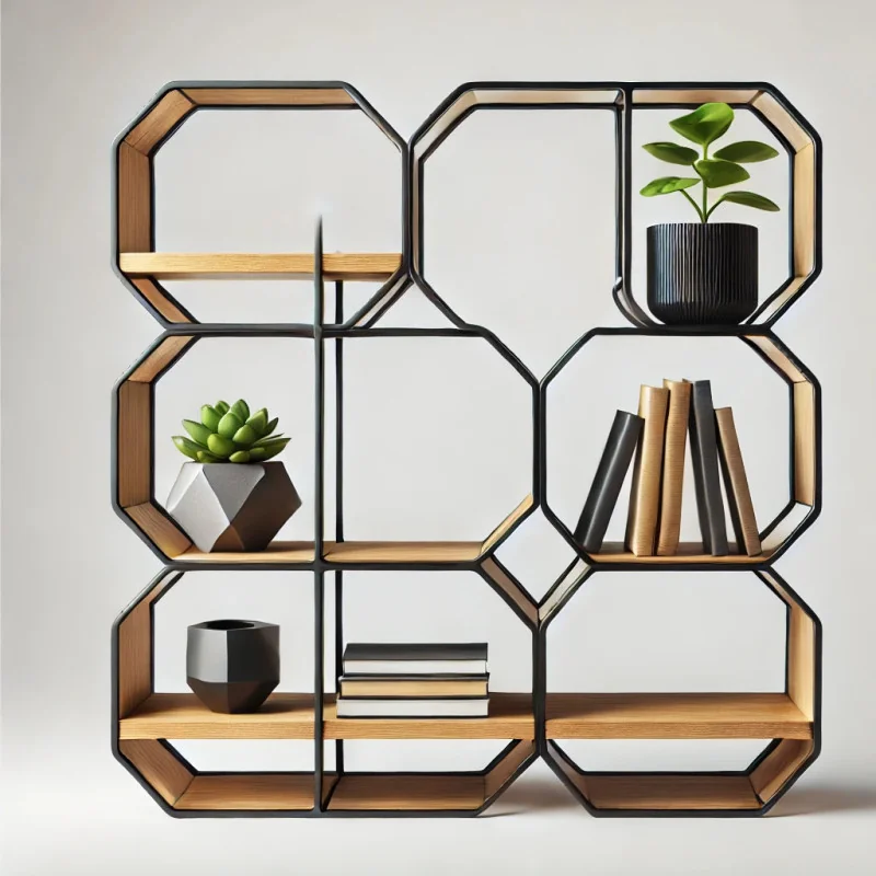 Elegancki regał dekoracyjny o nietypowym kształcie. Połączenie drewna i metalu tworzy harmonijną całość, idealną do eksponowania książek, roślin i ozdób.